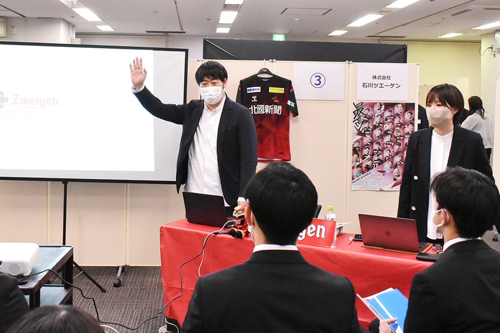サッカーJ2のツエーゲン金沢を運営する株式会社石川ツエーゲンは、「規模が小さいからこそ、色んな業務に関われる楽しさがある。スピード感、一体感が良さ」と紹介。