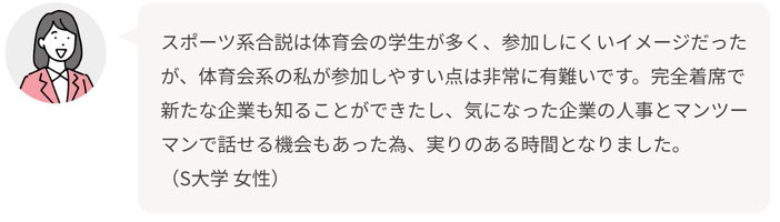 参加企業側も、「業界・業種・企業に関心がある方」や「スポーツ人材」を求めているため、お互いのミスマッチを防ぎ、採用に繋がりやすい仕組みとなっています。少人数制のため、印象や熱意も伝わりやすく、企業側から直接スカウトがもらえるチャンスもあります。
