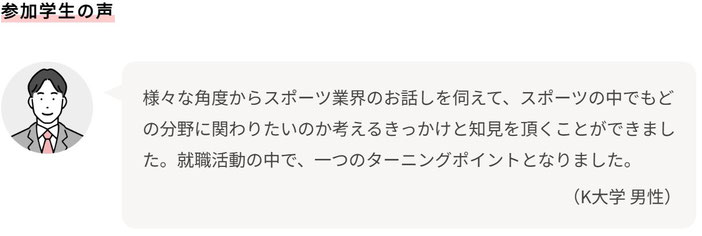 狭き門といわれているスポーツ業界の最前線で実際に働いている方達から直接生の声を聞き、具体的に仕事のイメージを持つことで、自身のやりたいことを明確にすることができます。なんと当イベントから毎年10名以上の学生が内定獲得!!