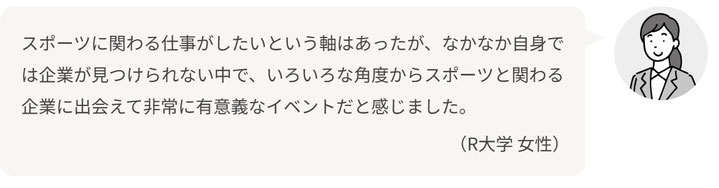 メーカー、卸、小売り、プロチーム、イベント企画運営など、スポーツ業界の情報を1日で効率良く収集・比較検討することができます。同じ業界の多様な領域の企業が複数社集まるのは非常に稀で、同時に「同じ温度感」で話を聞けるため、業界理解が一気に深まります。